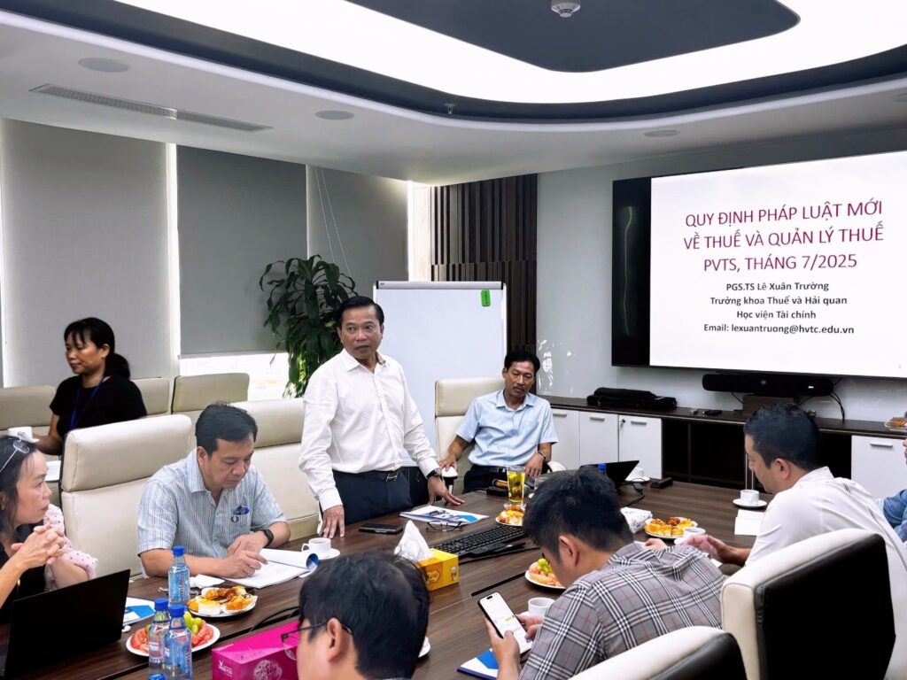 Ngày 29/07/2025, tại Trụ sở Ban Điều hành Dự án Lô 01/97&02/97, Lầu 16, Tòa nhà Cobi I, số 5 Hoàng Văn Thái, Phường Tân Mỹ, Thành phố Hồ Chí Minh, Công ty Cổ phần Thương mại & Dịch vụ Dầu khí (PVTS) kết hợp với Ban Điều hành đã tổ chức thành công chương trình đào tạo “Bồi dưỡng Chính sách Thuế mới 2025” cho các cán bộ quản lý và nhân viên các phòng ban chuyên môn. Khóa học do ông Lê Xuân Trường – PGS – TS Trưởng khoa Thuế & Hải quan Học viên Tài chính giảng dạy.